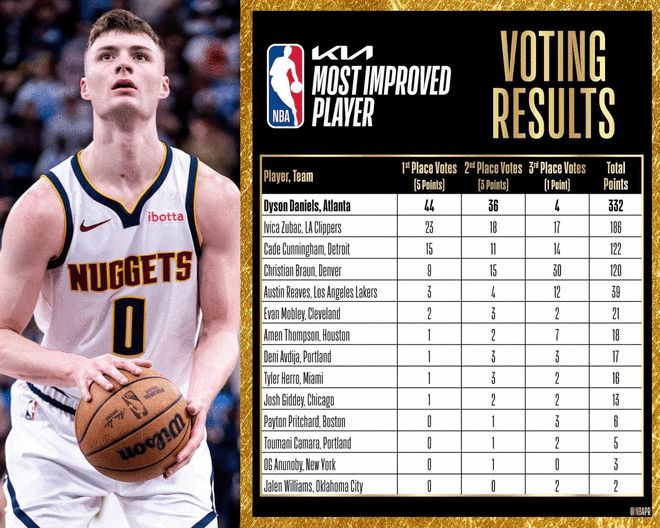 其实本赛季,布劳恩也有机会真正赢得一些能够放入收藏柜里的荣誉。在本赛季的最快进步球员评选中,布劳恩获得了非常多评奖者的认可,获得的投票得分也只比第三的坎宁安少2分。