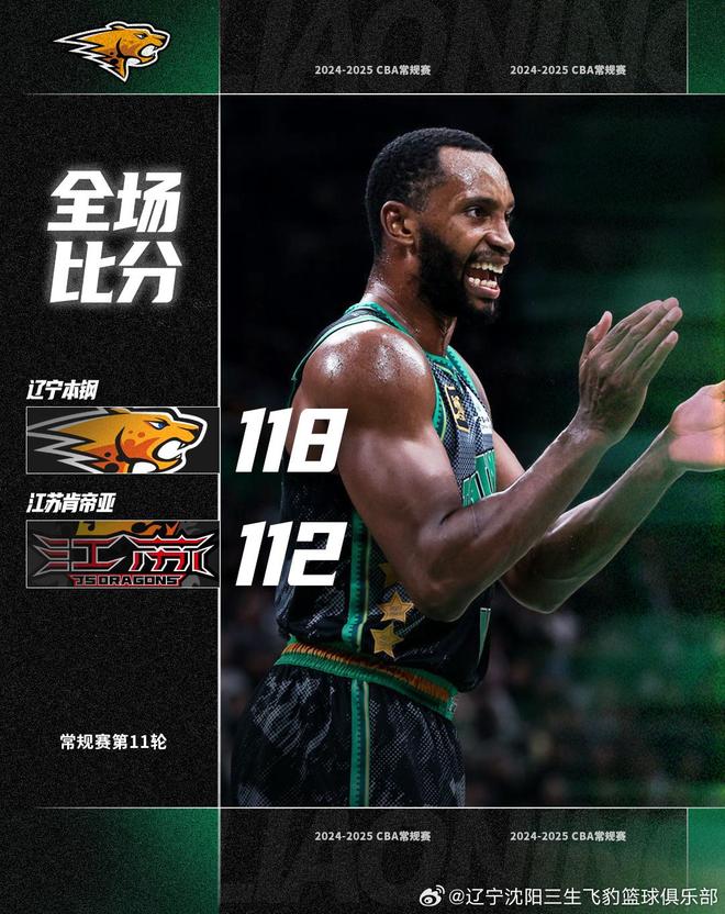 11月29日,CBA常规赛重燃战火,第11轮比赛辽宁队主场迎战江苏队。在新外援杰克逊爆炸得分表现带动下,江苏前三节结束领先10分。末节辽宁占尽上风强势反弹,迅速逆转分差。最终辽宁队以118-112获胜,江苏队遭遇11连败。四节比分分别为:34-36、22-31、32-31、30-14(辽宁队比分在前)。