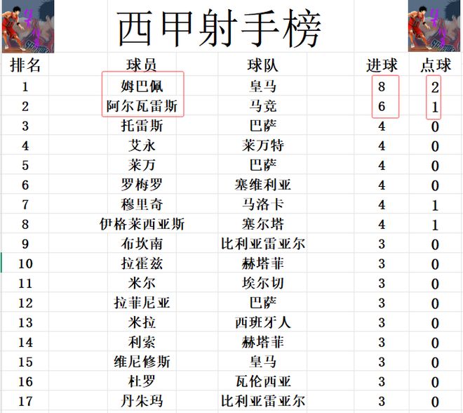 射手榜方面,姆巴佩8球继续领跑,阿尔瓦雷斯2球之差紧随其后。托雷斯,莱万,穆里奇,罗梅罗等人4球并列第3。维尼修斯,居莱尔,拉菲尼亚,米尔等人3球刚好挤入前十。马拉约尔今天打入一球,但还差1球才能进前十。