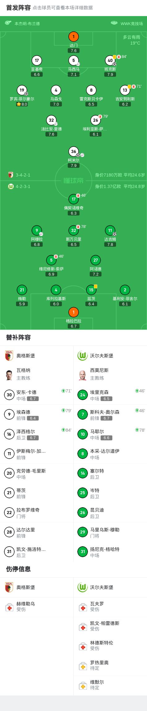 北京时间10月4日德甲日报德国足球顶级联赛 联赛 第6轮,奥格斯堡主场对阵沃尔夫斯堡。奥格斯堡班克斯破门,柯米尔破门,罗宾-菲尔豪尔破门。沃尔夫斯堡达吉姆破门。最终比分奥格斯堡 3-1 沃尔夫斯堡。